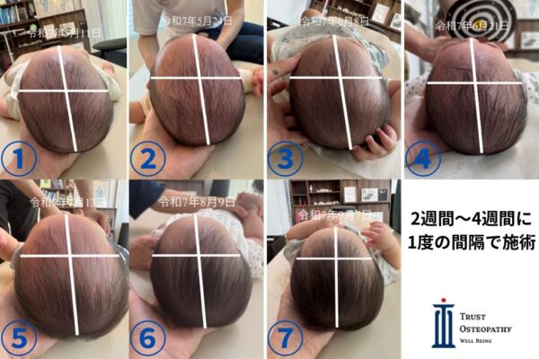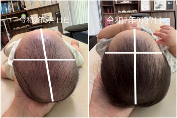 ヘルメットが外側から頭の形を整える一方で、オステオパシーは内側から組織の弾力性を回復させ、身体全体のバランスを整えることで、より効果的な改善が実現しました。