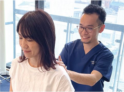 「どこまで動くか」ではなく「組織の柔らかさ」をチェックする独自の評価法で、四十肩の要因を探します。城東区の患者様の多くで、実は肩部以外に問題があることが考えられています。