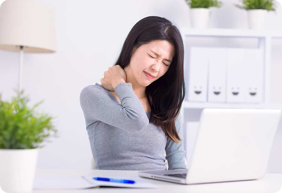 この姿勢では頭部が前方に突き出る形となり、首から肩にかけての筋肉が頭部の重さ(約5〜6kg)を支え続けなければなりません。